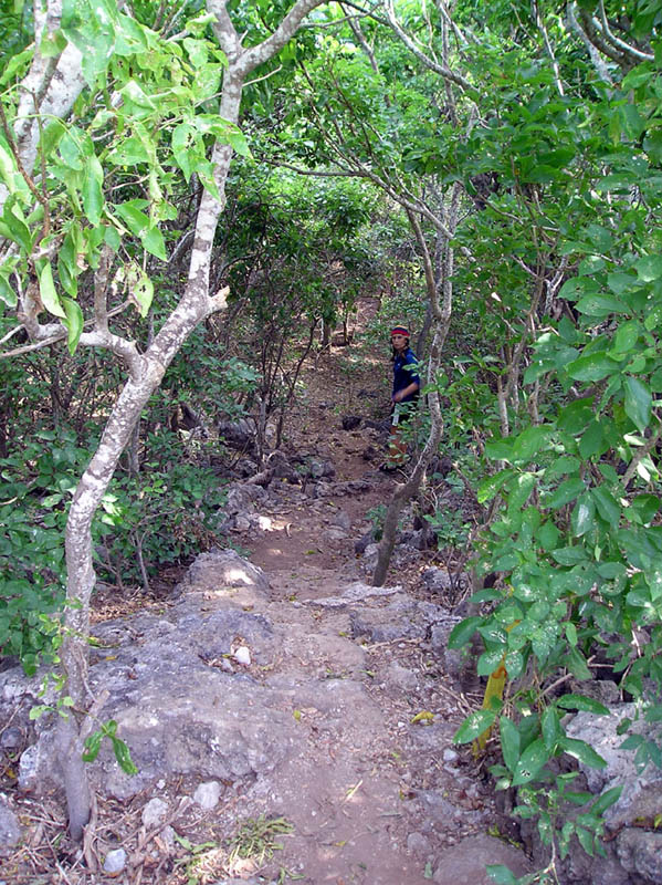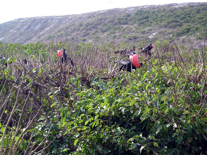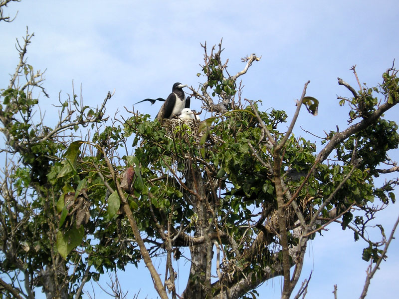 | We departed Mazatlan right on schedule (5 pm that is, not exactly 10 days after our arrival, more like 21). D and M both agreed that beginning an overnight voyage right as the sun was going down was a bit more nervewracking since we hadn't had the whole day to settle into our routines. Maureen however, bravely took on the first watch at 7 pm (the kids had decided to go for a nap in preparation for their watches, for some reason the adults took pity on them and let them sleep through the night). We were able to sail for only a couple of hours, and then proceeded to motor the next 16 hours. Isabella appeared on the horizon around 8 am with birds circling overhead. A few whales were spotted, always in the distance, usually with just the sighting of a huge splash of water following the breach. Our friends on Nanoo had left Mazatlan simultaneously with us, and were anchored off the east shore with a couple of other boats but the anchorage looked extremely rolly to us so we opted for the little bay around the corner. Meralee (an old friend from San Diego) was anchored here, and even though the waves were crashing into the cliffs close by we decided to drop the anchor. Definitely our scariest anchorage yet! We took Duke to shore by the fishing village and were promptly met by the warden of the island (bird sanctuary) whose second and third comment included "no dogs". While he was trying to spell "Tenacious" in his guest book, Duke took advantage of his poor english and relieved himself on the beach. The island is a nesting ground for blue footed boobies and frigate birds, iguanas are also found in abundance. We spent one day hiking through banana groves praying that we wouldn't get bombarded by bird droppings (without fail every time you would stop and look up, you would be directly under some nesting frigates). Weather reports suggested that gale force winds were going to be somewhere off the coast so we decided to head to San Blas after two nights at Isabella. We found no wind and motored 7 hours across to Mantanchen Bay (just south of San Blas). Two whales surfaced for air immediately in front of us, otherwise they were always in the distance. We got a really great picture of the slick they left on the water ... - M |